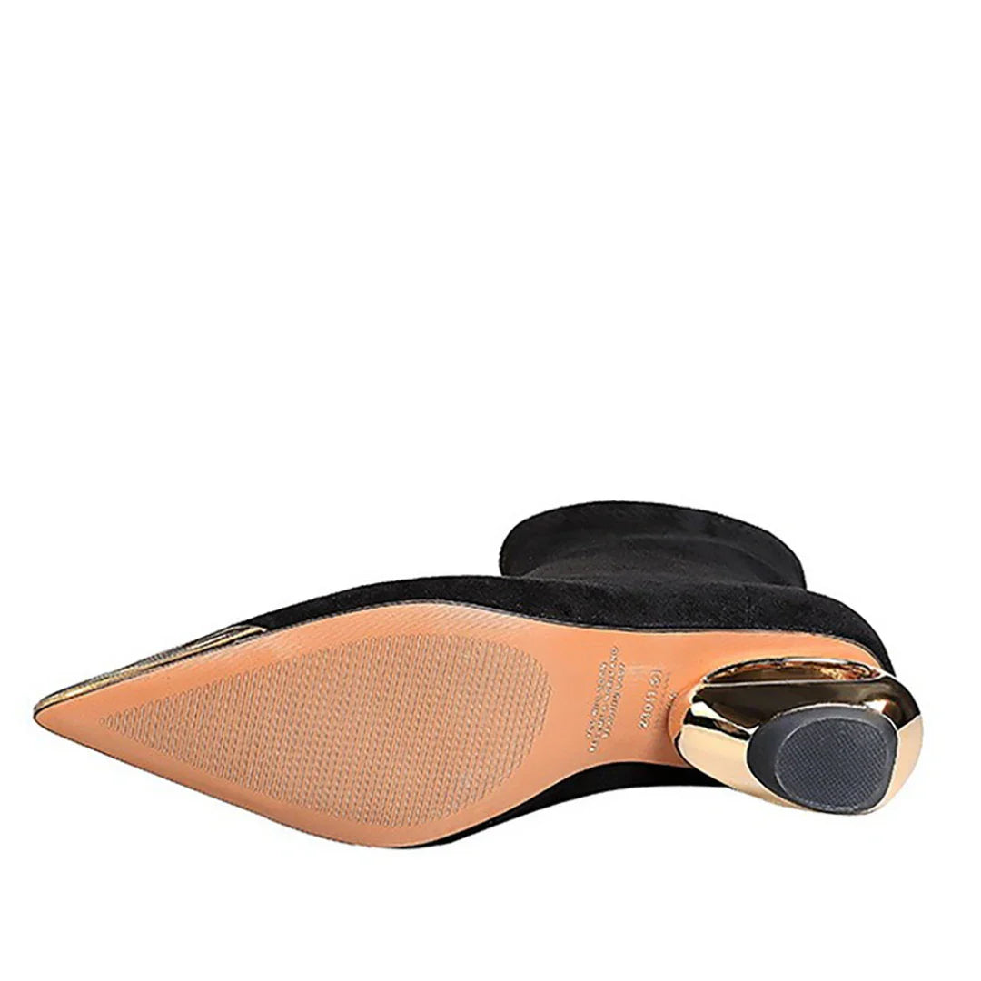 Crafted from ultra-lightweight faux suede, these modern ankle boots feature a striking metal point toe and a unique hollow mid-heel design for a bold statement. Perfect for stepping out in style at evening gatherings or city strolls.